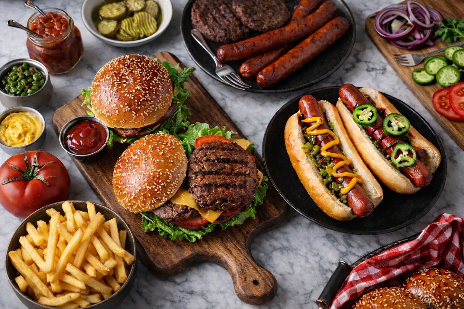 - Assorted condiments (Ketchup, Mustard, Relish, Mayonnaise, Tomatoes, Lettuce, Red onions, cheese for burger options and pickles)